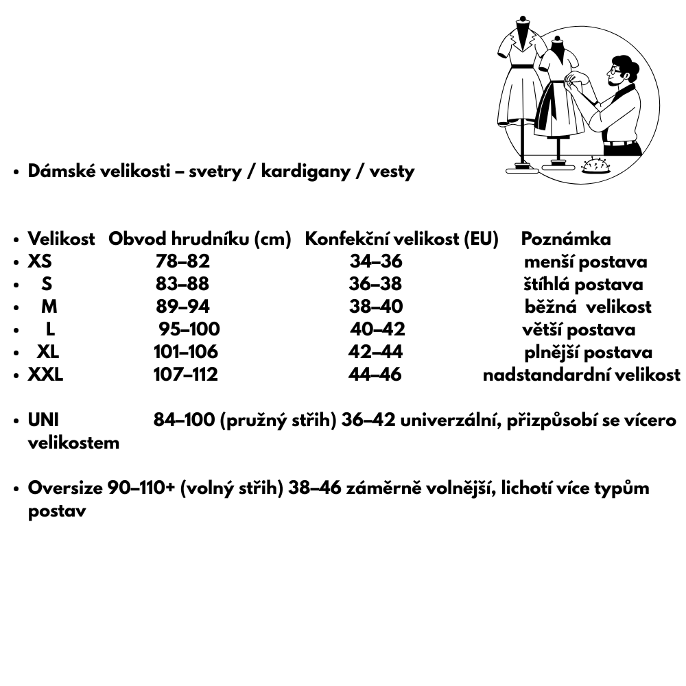 Pokud jsi mezi dvěma velikostmi a chceš volnější padnutí, zvol větší.